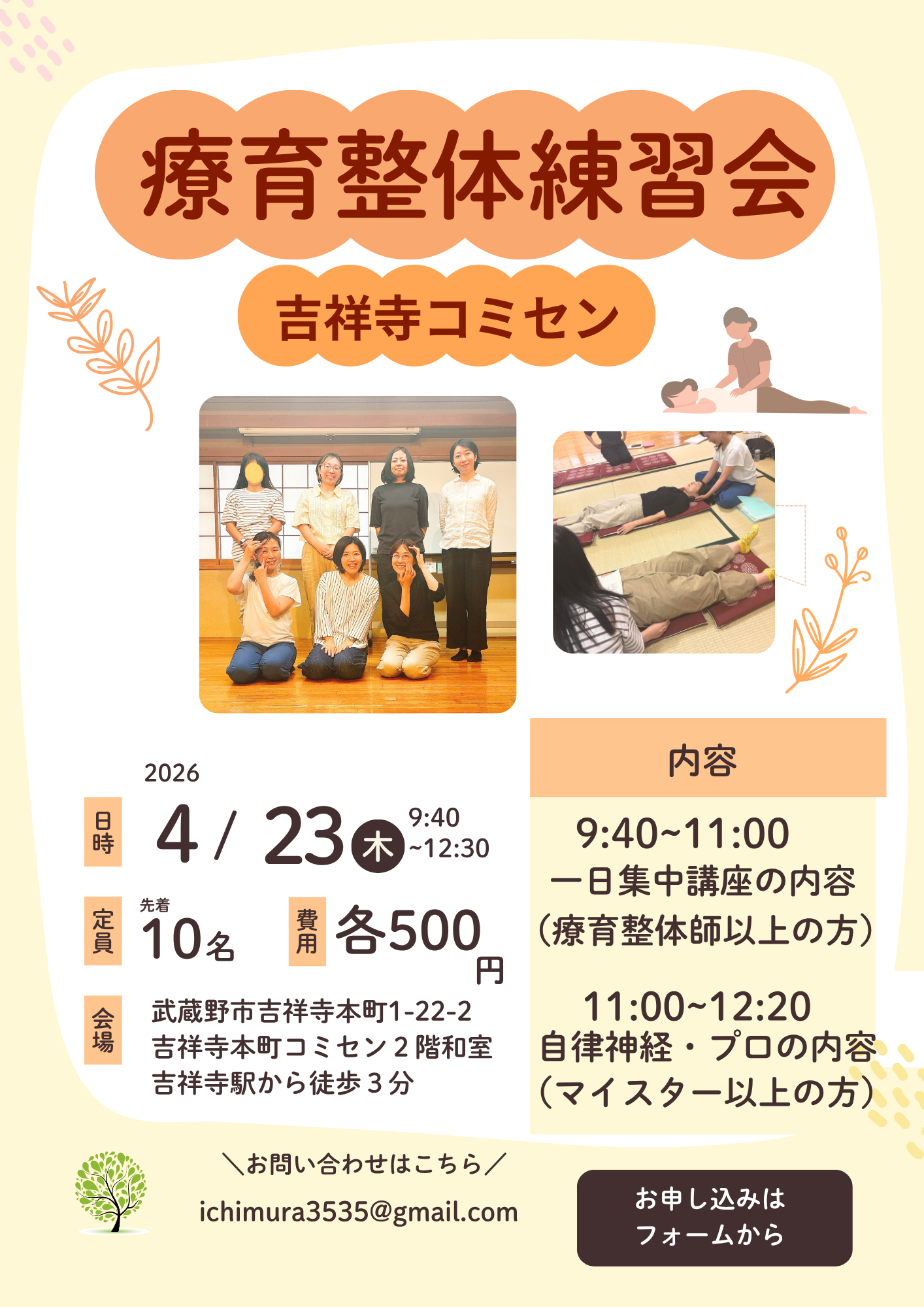 【東京吉祥寺】4月23日(木)療育整体師練習会