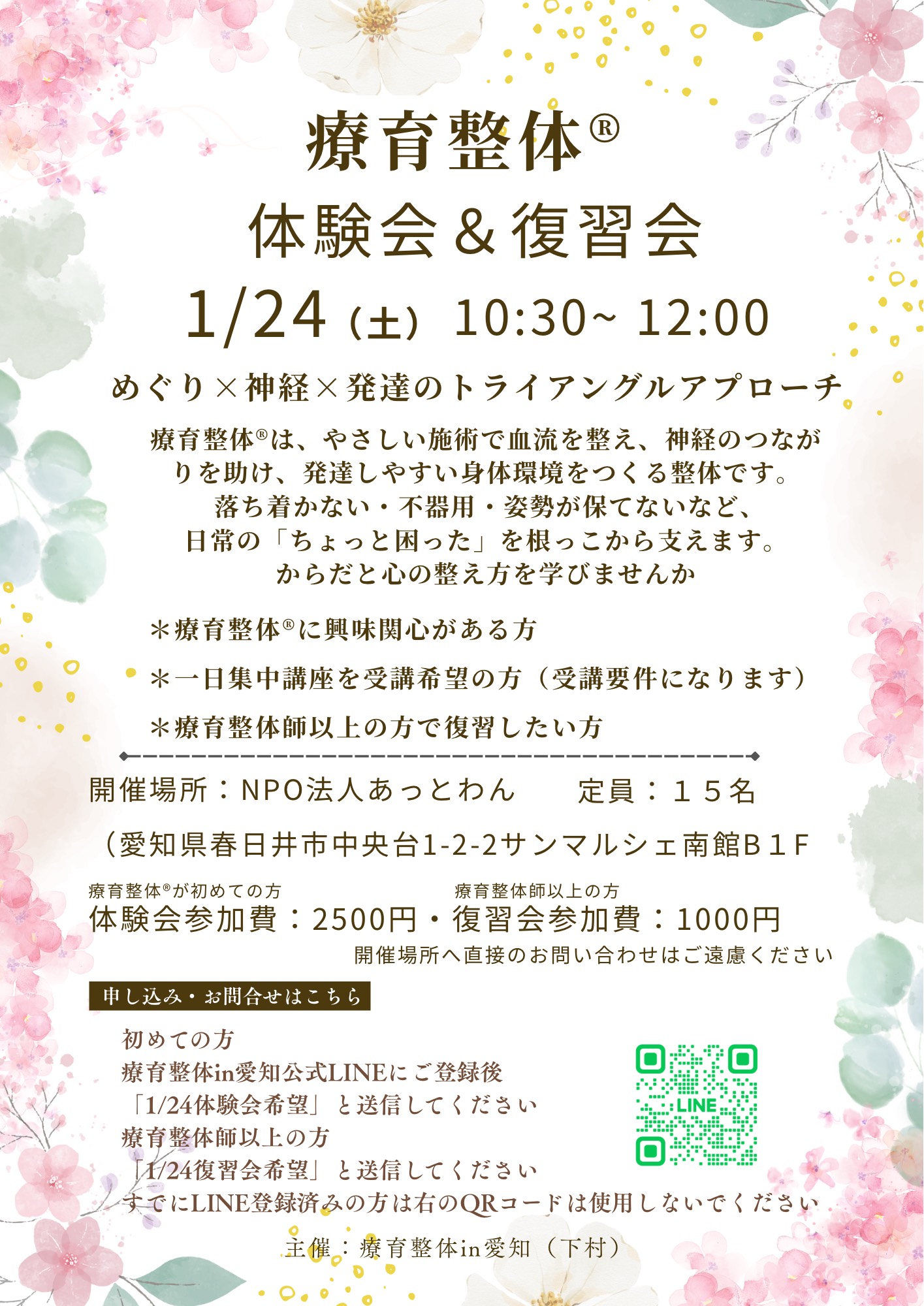 2025.12.03 【体験会×復習会】1月24日(土)愛知県春日井市 Tweet Share Hatena Pocket RSS feedly Pin it 【体験会】11月8日(土)石川県輪... 【アロマ×療育整体】1月21日(木...